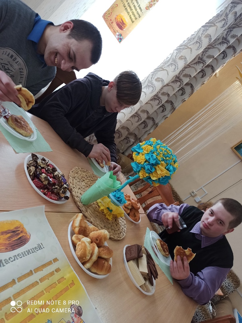 Посетили ребят скоморохи, да и девица-красавица, которые поздравили всех с праздником и угостили традиционным масленичным блюдом- горячими золотистыми блинами!