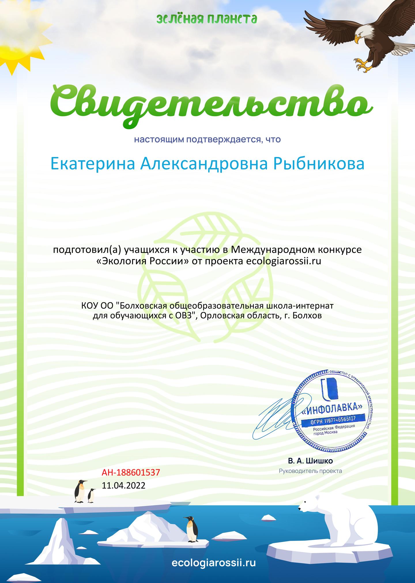 Учитель начальных классов и классный руководитель 4б класса Екатерина Александровна Рыбникова буквально растворяется в своих замечательных детках. Копилка совместных достижений за 4 года выросла до гигантских размеров, а информационный объем наградного материала давно пора исчислять в гигабайтах!Очередная победа радует славный дуэт "учитель-ученик" - в рамках экологического двухмесячника, программы по экологическому воспитанию, проходит Международный конкурс "Зеленая планета". Уверенно набранные 12 баллов (из 15) радуют маленького конкурсанта, его профессионального наставника и нас - всех педагогов и детей школы! Поздравляем! Молодцы и непременно только так держать!