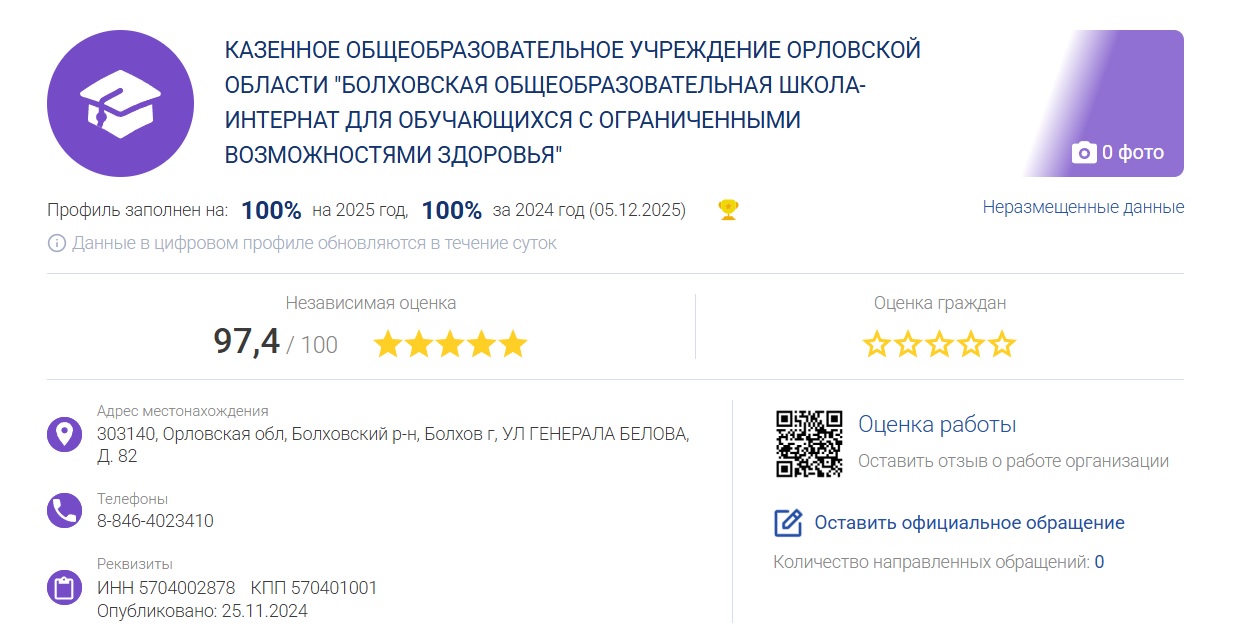 Результат КОУ ОО «Болховская общеобразовательная школа-интернат для обучающихся с ограниченными возможностями здоровья» в 2024 году - 97.4 балла