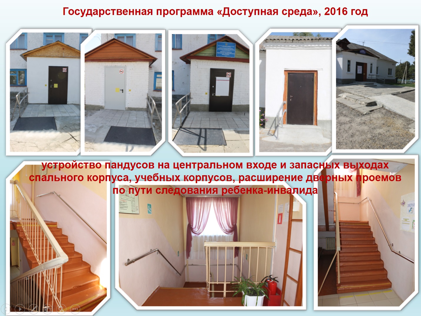 - обеспечение архитектурной доступности зданий и помещений школы-интерната, создание адаптивной образовательной среды (устройство пандусов на центральном входе и запасных выходах спального корпуса, учебных корпусов, расширение дверных проемов по пути следования ребенка-инвалида;