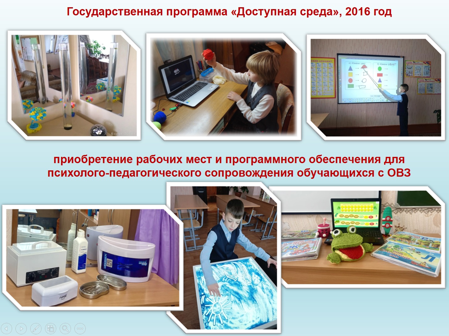 • совершенствование материально-технической базы в соответствии с потребностями обучающихся с ограниченными возможностями здоровья и детей - инвалидов, приобретение рабочих мест и программного обеспечения для психолого-педагогического сопровождения обучающихся с ОВЗ (для кабинетов дефектолога, логопеда, педагога-психолога).