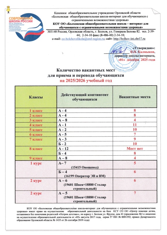 Количество вакантных мест для приема (перевода) обучающихся КОУ ОО "Болховская общеобразовательная школа-интернат для обучающихся с ограниченными возможностями здоровья" - по состоянию на 1 декабря 2025 года